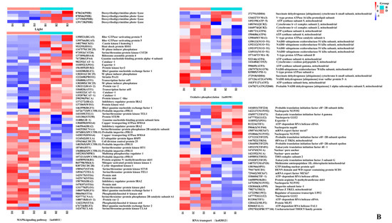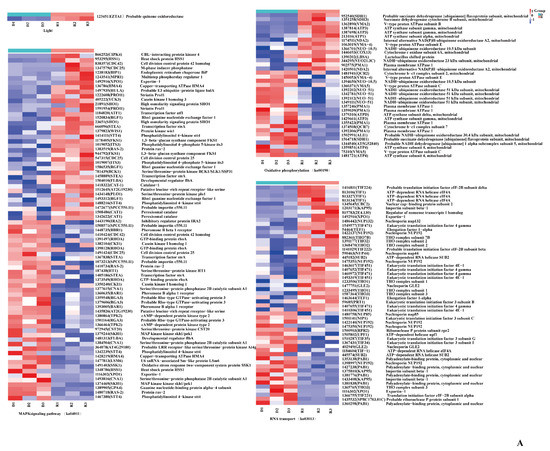 Considering the specificity of the three KEGG pathways (RT, MSPY, OP), candidate genes in these pathways were investigated and presented in Supplementary Table S9. In the RT pathway, the expression of UPF1 (1377433), and TIF221 (1366755), and some genes encoding nuclear proteins NUP192 (1398997), NUP45 (1423814), NUP192 (1475344), NUP85 (1480758), NUP132 (1501787), and NUP189 (1385072) were upregulated in blue-light primordium, while these genes encoding nuclear proteins were expressed at lower levels in the red-light treatment than in the blue-light treatment, suggesting that the relative inhibition of primordium differentiation by red light may result from the blockade of nuclear protein synthesis. In the pathway MSPY, the expression levels of the transcription factor STEA, developmental regulator FLBA, and several kinases, including SKH1 (1374469), CDC25 (1382011), WIS1 (1378155), MKK1 (1416976), CKI1 (1367085), and STT4 (580687), were upregulated in the blue-light primordium. In the OP pathway, the gene encoding V-type proton ATPase VMA5 (75310) was significantly upregulated in blue-light primordia, while the expression levels of other V-type proton ATPase genes (VMA1 1390441, VMA3 1456048, VMA13 1433531) were upregulated in red-light primordia.