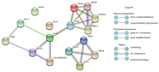 The STRING database of known and predicted protein interactions were used to find potential relationships between proteins in primordium differentiation analysis. Proteins (WC-1, PHR, ZTA1, TFCC, AGO1, OGG1, SR45A) that may respond to light analyzed in this research were used as input to STRING. Selected proteins were linked by known and predicted interactions, and a small network was established (Figure 10). In this network, those known proteins and other unknown interaction proteins were showed. Blue light photoreceptors WC-1 and PHR which we focused were predicted as neighborhood gene. At the same times, we found that proteins RNF41, NTH1, A0A369K0D4 interacted with PHR, and the protein CGPB interacted with WC-1.