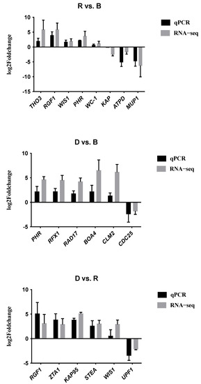 To validate the RNA-seq data, we performed quantitative RT-qPCR with the same primordium tissue. We randomly selected a dozen genes to verify the relative expression levels, including some genes that were upregulated under light and some that were downregulated. Figure 11 shows that the qPCR data were very consistent with the transcriptome sequencing data in the three comparisons, suggesting that the transcriptome data were reliable.