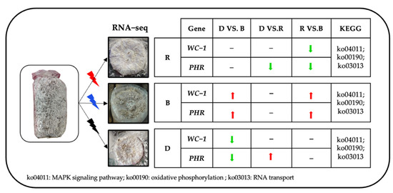 Immediately thereafter, we analyzed MAPK signaling pathway-related genes. We found that the expression of the gene STEA was upregulated under the light conditions in both comparisons, suggesting that this transcription factor is active only under light. Catalase-1 (CAT-1) detoxifies H2O2 by transforming it into water and oxygen, which can promote the oxidative stress response of fungi to light stimulation [18,20]. As expected, the gene expression of CAT-1 was upregulated under light in both comparisons. Then, the genes enriched in the oxidative phosphorylation pathway were analyzed. A class of genes encoding V-type proton ATPases showed upregulation in all groups, indicating that these enzymes have little relationship to light stimulation and are primarily involved in cell construction. Succinate dehydrogenase is an important enzyme positioned between oxidative phosphorylation and electron transfer and was upregulated under light in both the D vs. B comparison and the D vs. R comparison. We speculate that the high expression level of succinate dehydrogenase was caused by an increase in the oxidative stress response due to light stimulation.