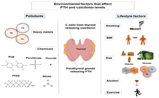 Maintenance of calcium homeostasis in the body is crucial since calcium regulates various physiological processes, including cellular signaling, protein and enzyme function, neurotransmission, contractility of the muscles, and blood coagulation [1]. Calcium homeostasis is regulated by parathyroid hormone (PTH), calcitonin, the active form of vitamin D (1α,25-dihydroxyvitamin D (1,25(OH)2D3)), and serum calcium and phosphate levels. Regulation of phosphate metabolism is also important as phosphate is involved in protein and enzyme function, cell signaling, and skeletal mineralization and is a component of cell membranes and nucleic acids [2,3]. The main factors that regulate phosphate homeostasis are PTH, fibroblast growth factor 23 (FGF-23), 1,25(OH)2D3, and Klotho [3]. Calcitonin is also involved in the regulation of phosphate levels [4,5]. PTH is released from the parathyroid glands [6], while calcitonin is released from thyroid C-cells [7]. Alternation of PTH levels can lead to the development of hyperparathyroidism and hypoparathyroidism. Changes in calcitonin levels have also been observed in pathological conditions (such as medullary thyroid carcinoma [8]). Therefore, variations in PTH and calcitonin levels may indicate that the normal functioning of parathyroid glands and thyroid is altered. Various factors can affect PTH and calcitonin levels, such as genetic factors [9,10,11], demographic factors (age [12,13,14], sex [15,16,17]), and environmental factors [18,19,20,21]. It is estimated that genetic factors account for 60% of variations in PTH levels [9], while the amount to which genetic factors contribute to interindividual variation in calcitonin levels has not been studied. This review aims to provide an insight into environmental factors (lifestyle factors and pollutants) that affect PTH and calcitonin levels (Figure 1).