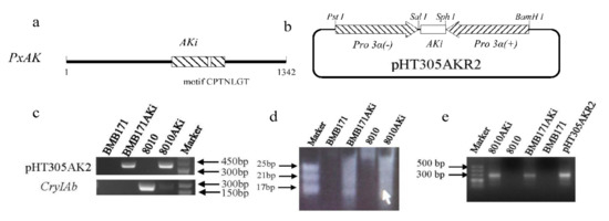 - Arantes, O.; Lereclus, D. Construction of cloning vectors for Bacillus thuringiensis. Gene 1991, 108, 115–119. [Google Scholar] [CrossRef]