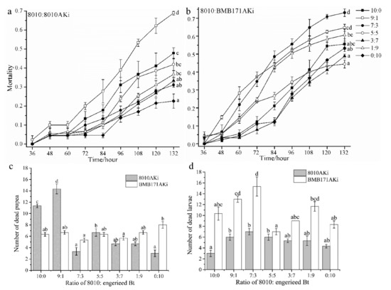 2.4. Growth and Development Characteristics of P. xylostella Feeding on the Mixtures of Bt and Engineered Bt