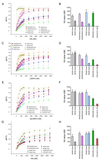 Additional IFT measurements were performed with LMWH, dsLMWH and HA for all TAMRA-labeled peptides. The binding isotherms and Kd values for LMWH are depicted in Figure 2C,D. In comparison with HS, the difference between dimer and trimer peptides is less pronounced on LMWH, especially for the KKAK-peptides. The affinity of the KKQK-3mer is similar for HS and LMWH. Furthermore, the peptide with the highest affinity for LMWH is CXCL9(74-103). In addition, with dsLMWH (Figure 2E,F), the highest affinity was measured for CXCL9(74-103). Remarkably, the peptide with the highest affinity for HA (Figure 2G,H) appeared to be the KKAK-3mer and not CXCL9(74-103).