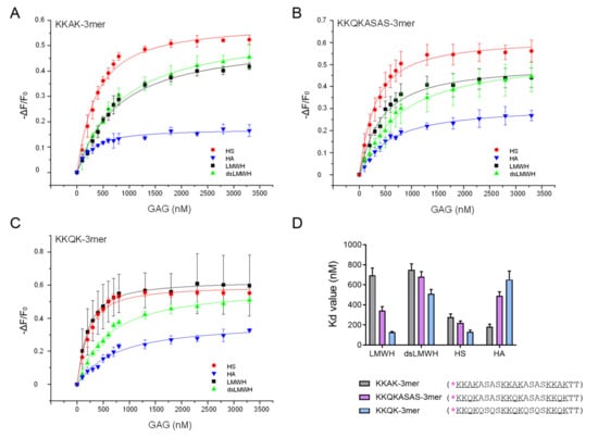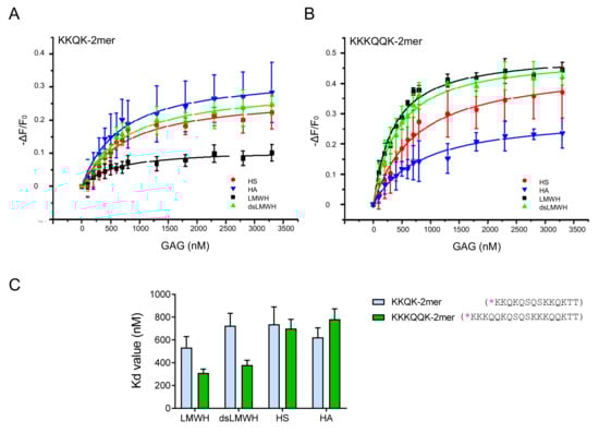 The contribution of short versus long GAG-binding motifs to GAG-binding affinity was investigated by comparing the KKQK-2mer and the KKKQQK-2mer, containing two short and two long GAG-binding motifs, respectively. Figure 4A,B represent the binding isotherms of these peptides, and their Kd values are displayed in Figure 4C. The KKKQQK-2mer was characterized by a higher affinity for LMWH and dsLMWH in comparison with the KKQK-2mer, indicating a possible role of long GAG-binding motifs for binding to these GAGs. For HS and HA, only minor differences between the two peptides were observed.