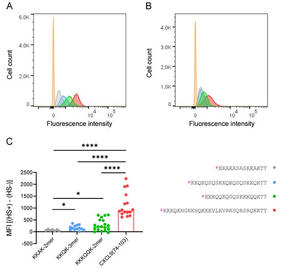 Based on the IFT data, four peptides were selected to investigate their binding to cellular GAGs on CHO cells. A fixed dose (0.24 nmol) of TAMRA-labeled peptide (KKAK-2mer, KKQK-3mer, KKKQQK-2mer or CXCL9(74-103)) was added to the cells. Histograms resulting from the flow cytometry analysis are shown in Figure 7A,B for HS+ and HS− CHO cells, respectively. The fluorescence intensity on the HS− CHO cells is shifted to the left compared with the HS+ CHO cells, indicating a decreased binding of the TAMRA-labeled peptides to the HS− CHO cells. Remarkably, the binding of the TAMRA-labeled peptides to the HS− CHO cells was not completely abolished in comparison with the HS+ CHO cells. The median fluorescence intensity (MFI) values were calculated by subtracting the MFI of the unstained sample from the MFI of the sample with TAMRA-labeled peptide, per cell type (HS+ or HS− CHO cells) and compared for the different TAMRA-labeled peptides. All four peptides that are shown in Figure 7 bound significantly better to HS+ CHO cells in comparison with HS− CHO cells (data not shown; Wilcoxon test; KKAK-2mer, p < 0.05; KKQK-3mer, p < 0.001; KKKQQK-2mer, p < 0.0001; CXCL9(74-103), p < 0.0001). In addition, in order to compare the different peptides, the MFI values of the TAMRA-labeled peptide bound to the HS− CHO cells were subtracted from those of the HS+ CHO cells, per peptide. The resulting values (MFI ([HS+]–[HS−])) for each peptide are shown in Figure 7C. The binding capacity of CXCL9(74-103) for cellular GAGs was significantly higher (p < 0.0001) compared with that of the three other peptides (KKAK-2mer, KKQK-3mer and KKKQQK-2mer). Furthermore, the capacities of both the KKKQQK-2mer and the KKQK-3mer for binding to cellular GAGs were significantly higher (p < 0.05) in comparison with the binding capacity of the KKAK-2mer. To summarize, the order of increasing capacity of the TAMRA-labeled peptides for binding to cellular GAGs is: KKAK-2mer < KKQK-3mer < KKKQQK-2mer < CXCL9(74-103).
