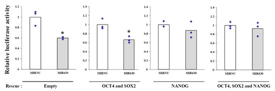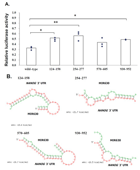2.4. MIR630 Targets the Putative Binding Sites in the 3′UTR of NANOG