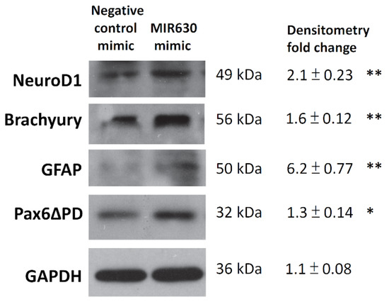 To further determine whether MIR630 plays a role in NT2/D1 cell differentiation, cells were transfected with negative control mimic or MIR630 mimic. After 3 days, total cellular proteins were extracted and the expression of some selected differentiation markers was analyzed by Western blot. NeuroD1, the earliest marker of neuronal differentiation, was found to be upregulated in MIR630-transfected cells (Figure 4). Moreover, brachyury, the earliest marker of mesodermal and endodermal differentiation was also increased. Glial fibrillary acidic protein (GFAP), a recognized marker of astrocyte differentiation, was also sharply induced. A 32/33k Da pax6 isoform, Pax6∆PD, was also upregulated in MIR630-transfected cells and this isoform was specifically detected in the developing eye [25]. These results suggest that MIR630 may lead to the differentiation of NT2/D1 cells.