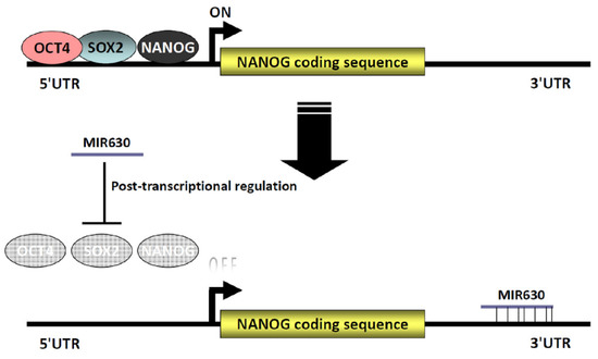 A schematic diagram depicting the MIR630-repressed NANOG expression via transcriptional and post-transcriptional regulation. We propose that MIR630 represses NANOG through transcriptional and post-transcriptional regulation. Transcription of NANOG is regulated by the OCT4/SOX2 complexes through an adjacent pair of highly conserved composite Sox-Octamer element in the 5′-flanking region of the NANOG promoter. In addition, NANOG autoregulates its expression by binding to the proximal promoter. In the present study, we showed that MIR630 directly targets the NANOG, POU5F1, and SOX2 3′UTRs to repress their expression. NANOG was further reduced due to the downregulation of NANOG, OCT4, and SOX2 levels.