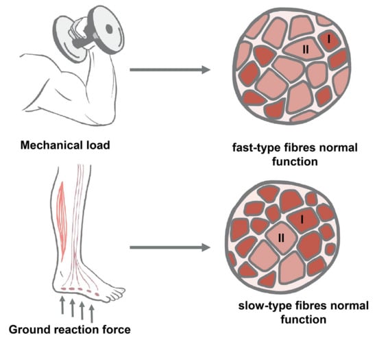 Involvement of mechanical load and ground reaction force into the regulation of slow-type (type I) or fast-type (type II) skeletal muscle fibers.