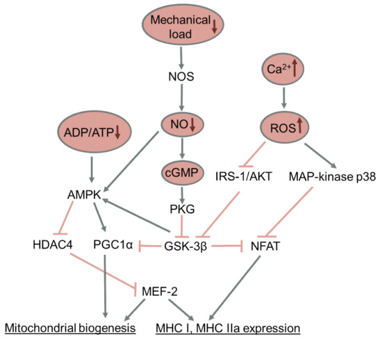 Little is known about the molecular mechanisms of the decreased expression of PGC-1α under the conditions of functional unloading. Inhibition of GSK-3β during 2-week hindlimb unloading was shown to prevent a decrease in the content of PGC-1α and components of the mitochondrial respiratory chain [231]. The administration of nitric oxide donors during hindlimb unloading and mechanical stimulation of the support zones of the feet both prevented the activation of GSK-3β and decreased the expression of PGC-1α, along with the prevention of a decrease in the expression of the slow-twitch MyHC isoform [83,150]. It was shown on myotubes C2C12 that PGC-1α expression can be regulated via the action of GSK-3β on the TFEB transcription factor [235]. It was also shown that the slow-twitch MyHC isoform can regulate the expression of PGC-1α by means of micro-RNA-499 [236]. Thus, GSK-3β kinase is a key regulator linking the activity of skeletal muscle and the slow-twitch, oxidative phenotype of muscle fibers, which determines muscle resistance to fatigue. The key signaling pathways affecting slow-to-fast fiber-type transformation and mitochondrial biogenesis are summarized in Figure 3.