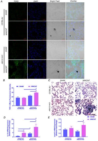 Myeloid ABCG1 deficiency increases fibrosis development and TGF-β expression in the lung of MWCNT instilled mice. (A) Representative images showing an increase in TGF-β expression in lung sections of MWCNT instilled ABCG1 KO mice. Lung sections from wild-type C57BL/6J mice or ABCG1 KO mice either sham- or MWCNT instilled were stained with TGF-β (green) and DAPI (blue). Bright field showing the presence of MWCNT in lung tissues. Scale bars: 50 μm. (B) Graphical representation of TGF-β mean fluorescence intensities using Zen 3.1 blue edition. (C) Representative light micrographs showing an increase in fibrosis in lung sections of MWCNT instilled ABCG1 KO mice using trichrome staining. Scale bars: 50 μm. (D,E) Measurement of IL-13 and smad-3 mRNA expression, respectively, in BAL cells using qRT-PCR (* p ≤ 0.05, N ≥ 3).