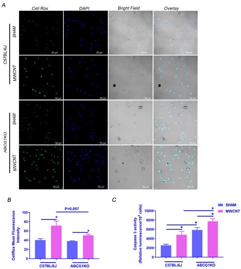 Previous studies show that ABCG1 deficient macrophages are more susceptible to apoptosis by oxidative stress [32]. We reported that MWCNT-induced granulomatous inflammation in wild-type mice is associated with the induction of oxidative stress and apoptosis in alveolar macrophages [19]. To determine whether ABCG1 deficiency promotes MWCNT-induced apoptosis, we investigated the effect of MWCNT on oxidative stress within BAL cells of ABCG1 KO mice by live-cell fluorescence imaging using the CellRox reagent. As shown in Figure 2A,B, the fluorescence intensity was significantly elevated in MWCNT instilled wild-type and ABCG1 KO mice as compared to sham groups. Interestingly, CellRox fluorescence in MWCNT instilled ABCG1 KO mice is less than in MWCNT instilled wild-type mice (p = 0.057). However, apoptosis, as measured by a caspase 3/7 activity assay, was higher (1.5-fold, p ≤ 0.01) in BAL cells of MWCNT instilled ABCG1 KO as compared to wild-type (Figure 2C). These results suggest that ABCG1 deficient myeloid cells may be more vulnerable to MWCNT-induced apoptosis than wild-type controls, and this process is independent of oxidative stress.