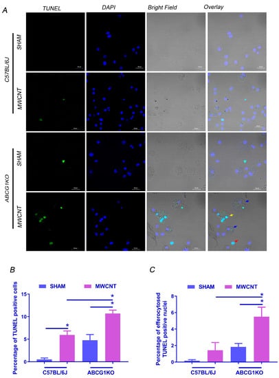 Myeloid ABCG1 deficiency increases the percentage of efferocytosed apoptotic cells after MWCNT instillation. (A) Representative images showing TUNEL staining for BAL cells (40×). Cytospins of BAL cells from C57BL/6J and ABCG1 KO mice either sham or MWCNT instilled were stained with TUNEL reagent for DNA fragmentation (green) and nuclear stain, DAPI (blue). Bright field showing non-engulfed apoptotic cells (red arrow), efferocytosed TUNEL+ nuclei (blue arrow) and multi-nucleated apoptotic cell (yellow arrow). (B) Graphical representation of the percentage of TUNEL positive cells in BAL cytospins. (C) Graphical representation of the percentage of efferocytosed TUNEL positive cells. Quantification of TUNEL staining was performed blindly on 18 random 20× fields per one cytospin for each mouse. *, significant difference, p ≤ 0.05, N ≥ 3.