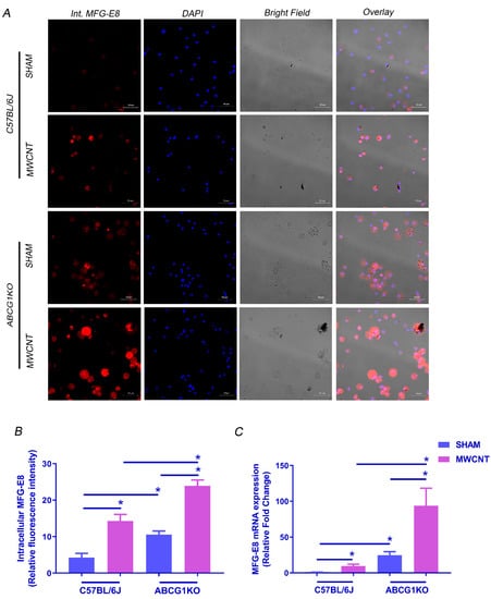 Myeloid ABCG1 deficiency increases MFG-E8 expression in BAL cells after MWCNT instillation. (A) Representative images for intracellular MFG-E8 expression in BAL cells from wild-type mice or ABCG1 KO mice either sham or MWCNT instilled. BAL cytospins were fixed permeabilized and stained with MFG-E8 (red) and nuclear stain, DAPI (blue). (B) Graphical representation of the MFG-E8 mean fluorescence intensities using Zen 3.1 blue edition. (C) Measurement of mRNA expression of MFG-E8 in BAL cells was measured using qRT-PCR. (* p ≤ 0.05, N ≥ 3).