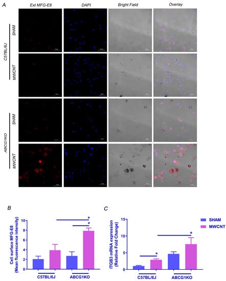 Efferocytosis can be mediated by MFG-E8, a bridging protein that is released from macrophages to bind phosphatidylserine (PS) on the surface of apoptotic cells. MFG-E8-opsonized cells are then recognized by integrin receptors αvβ3 or αvβ5 on macrophages for internalization [42]. To investigate whether efferocytosis in ABCG1 KO macrophages is associated with an increase in MFG-E8-αvβ3/5 signaling, levels for MFG-E8, integrin αv (ITGAV), integrin β3 (ITGB3) and integrin β5 (ITGB5) were measured. An increase in MFG-E8 mRNA and protein (Figure 5A–C and Figure S5) was observed in BAL cells of both wild-type and ABCG1 KO MWCNT instilled mice. MFG-E8 expression is constitutively high in ABCG1 KO sham mice as compared to wild-type, but a further increase was observed after MWCNT instillation as compared to MWCNT instilled wild-type mice. Since MFG-E8 is released from macrophages to bind apoptotic cells, cell surface localized MFG-E8 in non-permeabilized BAL cytospins was measured (Figure 6A,B and Figure S6). Importantly, only MWCNT instilled ABCG1 KO mice demonstrated a significant increase in cell surface MFG-E8 when compared to wild-type. This observation is consistent with an increase in efferocytosed apoptotic cells. The analysis of ITGAV and ITGB5 mRNA revealed no significant difference between MWCNT instilled wild-type and ABCG1 KO mice (Figure S5). However, a significant increase in ITGB3 level was seen in BAL cells of MWCNT instilled compared to wild-type sham instilled mice (2.9-fold, p ≤ 0.001). ABCG1 KO mice showed constitutively high levels of ITGB3 when compared to wild-type (4.7-fold, p ≤ 0.001), and MWCNT instillation resulted in a further increase in this expression (Figure 6C). These results suggest that ABCG1 deficiency may promote the MFG-E8-αvβ3/5 signaling pathway and may initiate efferocytosis in the BAL of ABCG1 KO mice after MWCNT instillation.