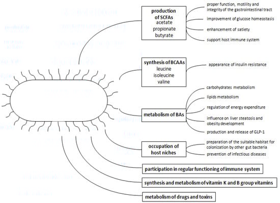 Bacteria belonging to the phyla Proteobacteria and Actinobacteria are less abundant than Firmicutes and Bacteroidetes [56]. A temporary dominance of Proteobacteria, especially Enterobacteriaceae, has been found in newborn mice [57]. By consuming oxygen and altering the pH, Proteobacteria species, facultative anaerobes, play a key role in preparing the suitable habitat of the infant gut for colonization by strict anaerobes [58]. Vaughn et al. have shown that mice fed with a high-fat diet are characterized by microbiota changes, especially an increase in the level of Proteobacteria, which are probably directly associated with the reorganization of vagal afferents and microglia activation in the nucleus of the solitary tract [59]. A short summary of the role of the gut microbiota is presented in Figure 1.