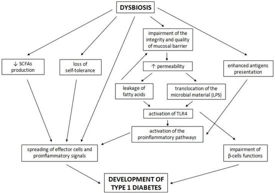 The alteration of intestinal microbes can induce the leakage of fatty acids and lipopolysaccharides (LPSs) by destroying the intestinal mucosal barrier. This causes the activation of toll-like receptor 4 (TLR4), which results in metabolic inflammation [94]. TLRs are engaged in maturation of dendritic cells and recognizing pathogen-associated molecular patterns derived from microbiota [95]. They contribute to protecting the host from infectious microbes. MyD88 is an adaptor not only for TLRs and interleukin 1, but also other innate immune receptors. A defect of MyD88 can alter the composition of microflora in the distal part of the intestine [92]. Moreover, in NOD mice, the knockout of MyD88 protected against T1D development [93]. LPS is a bacterial endotoxin and one of the components of the outer membrane of Gram-negative bacterial species, and probably acts as a molecular link between gut microbiota, inflammation and T1D [53]. In a case-control study, it was proved that patients with T1D have higher circulating LPS levels than those without diabetes [96]. LPSs can be involved in diabetes development, because they lead to the impairment of pancreatic β-cell function and increase the level of pro-inflammatory cytokines [97]. In mouse models, an oral injection of E. coli LPS improved local immunity, while an intraperitoneal injection of E. coli LPS improved the autoimmune response and decreased the incidence of T1D [98,99]. However, it is difficult to conclude whether microbial alteration is causal or consequential for T1D development. The possible influence of dysbiosis on T1D development is presented in Figure 2. Most current studies mainly show the involvement of intestinal microbiota in the β-cell autoimmunity process, and do not focus on an explanation of whether gut microbiota activate T1D. On the one hand, the state of dysbiosis during the maturation of the immune system can destroy self-tolerance and control of the inflammatory response, which can eventually lead to increased susceptibility to immune-mediated diseases, such as T1D. However, on the other hand, pro-inflammatory intestinal dysbiosis and changed microbial diversity can cause T1D activation after seroconversion. How the mechanisms of relatively local intestinal inflammation spread to an autoimmune process of the whole organism is not clear enough [66]. It is necessary to perform new interventional studies and not only observational ones. There exists a strong need to prove the causal relationship between T1D and intestinal microbiota, and the exact mechanisms that participate in the processes described above.