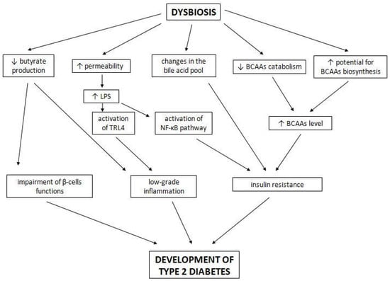 Similar to T1D, T2D is probably associated with LPSs, which trigger the development of inflammation and IR acting through TLR4 [141,142]. TLR4 belongs to a family of pattern-recognition receptors, toll-like receptors, which contribute to the activation of pro-inflammatory signaling pathways, and cytokine expression and secretion in the presence of bacterial pathogens [143,144]. In vitro and in vivo studies have shown that free fatty acids can influence macrophages and adipocytes through TLR4, inducing inflammation. As a result, they are able to suppress insulin signaling through serine phosphorylation of insulin receptor substrate 1 (IRS-1) and influence glucose homeostasis [143,145]. This IRS-1 modification is considered to be a marker of the IR state [146]. It has been indicated that individuals with diabetes are characterized by higher fasting and postprandial concentrations of LPSs, in comparison to non-diabetic individuals, which can be caused by an increased permeability of the intestine and enhanced LPS absorption [141]. Increased circulating LPSs enhance the expression of inducible nitric oxide synthase (iNOS) through the activation of TLR4, which, as a consequence, induces protein S-nitrosation/S-nitrosylation of the insulin receptor, IRS-1 and Akt, and alters their proper functions [147,148,149,150,151]. Moreover, it has been suggested that metabolic endotoxemia dysregulates the inflammatory tone and triggers body weight gain and diabetes [141]. Probably, the gut microbiota have properties to modify this state of inflammation and endotoxemia due to their ability to affect the permeability of the intestine [152,153]. Endotoxemia in obesity and T2D becomes apparent, but there is still a lack of human studies that would show increased intestinal permeability and changed tight junction expression evidently. The possible influence of dysbiosis on T2D development is presented in Figure 3.