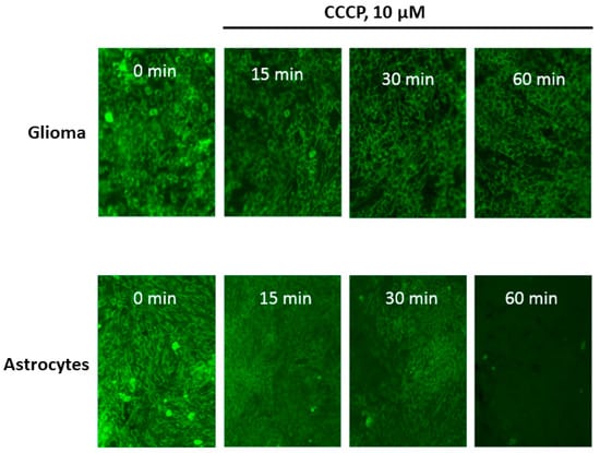 At the first step of the study, we compared the degree of release of Rh123 from glioma cells and astrocytes after the elimination of the proton-motive force by adding an uncoupler CCCP in concentrations that deliberately eliminate the electrochemical potential of hydrogen ions in mitochondria (10 µM). The fundamental difference from the conditions for the release of Rh123 from mitochondria and cells observed in [] consisted in the fact that in this work, the mitochondria in the cells retained the membrane potential and the release was carried out due to the natural leakage of Rh123 from the cells into an environment in which Rh123 was absent, while in our conditions, the basis for the release of Rh123 was the elimination of the driving force of the accumulation of Rh123 in the cell. From Figure 1 it can be seen that there is a delayed release of Rh123 in glioma cells, while after 60 min of exposure to the CCCP, almost no Rh123 remains in astrocytes, in glioma cells, the fluorescence is present at a fairly high level. After 2 h, glioma cells dramatically lose the fluorescence and after 18 h almost no fluorescence can be detected in glioma cells (not shown). Our analysis showed that there is no significant difference between the content of mitochondria in the two types of cells. We also note the initially increased heterogeneity of fluorescence of Rh123-stained astrocytes compared to glioma cells, which demonstrate a fairly homogeneous distribution of fluorescence between cells.