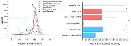 Uncoupler-induced changes in fluorescence of Rh123-stained astrocytes and glioma cells evaluated by flow cytometry. Left panel, distribution of fluorescence (1, green, astrocytes incubated with 2 µM Rh123 and 10 µM CCCP; 2, purple, glioma cells incubated with Rh123 and CCCP for 15 min; 3, pink, as in 1 but without CCCP; 4, red, as in 2 but without CCCP; 5, grey, astrocytes, no additions; 6, light pink glioma, no additions). Right panel, mean fluorescence of Rh123 based on data showing in left panel. * p < 0.05 according to the Wilcoxon criterion, ** p < 0.05 according to the Mann-Whitney U-test.