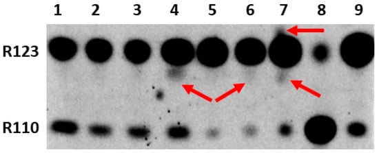 Butanol extracts were obtained by adding 96% butanol to the vial containing a pellet obtained after centrifugation in an equal volume or a supernatant in the ratio of 1 volume of butanol to 5 volumes of the supernatant. After gently shaking for 2 min, the system was left for the time necessary for the formation of the butanol fraction at the top of the vial. Butanol extracts were removed from the vial, evaporated in a rotary evaporator RV 3 Flex at a temperature of 40°C and rotation mode 5.5 until the liquid was completely evaporated. The dry residue was dissolved in 50% ethanol. The resulting solution was analyzed by thin-layer chromatography on silica gel plates (TLC Silica gel 60 F254 (Merck, Darmstadt, Germany)). As a mobile phase, a mixture of butanol–water–ethanol was selected in a ratio of 9: 2: 1. Initially, samples with a volume of 1 µL were deposited at a level of 1 cm from the lower edge of the plate, which was immersed in a solvent system. Furthermore, in some cases, the application was normalized; for each sample, such a volume of application was selected in order to unify the detected area of the component corresponding to Rh123. This allowed us to estimate the relative contribution of other detectable components. Next, the membranes were dried and photographed on a ChemiDoc MP device with proper software. To detect Rh123, fluorescence was excited at a wavelength of 488 nm and collected emission at >530 nm.