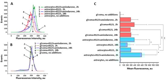 The mean fluorescence intensity measured by flow cytometry in astrocytes and glioma cells incubated with Rh123 (2 µM). (A) Distribution of fluorescence in astrocyte cells depending on the agents added to the incubation medium and incubation time; 1, green, astrocytes with Rh123 and amiodarone (2 µM) incubated for 2 h; 2, pink, astrocytes incubated with Rh123 for 2 h; 3, blue, as in 1 but incubated for 24 h; 4, red as in 2 but incubated for 24 h; 5, astrocytes, no additions; (B) Distribution of fluorescence in glioma cells depending on the added agents and incubation time; 1, light blue, glioma cells incubated with rhodamine 123 and amiodarone for 2 h; 2, red, as in 1 but without amiodarone; 3, dark blue, as in 1 but incubated for 24 h; 4, green, as in 2 but incubated for 24 h; 5, pink, glioma cell, no additions; (C) Median fluorescence of Rh123 in astrocyte and glioma cells treated with Rh123 and amiodarone (2 µM) for 2 or 24 h. * p < 0.05 according to the Wilcoxon criterion, ** p < 0.05 according to the Mann-Whitney U-test.