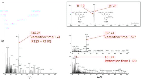 Mass spectrometry of butanol extracts of glioma cells after their cultivation with Rh123 (2 µM) for 2 h. The two factions are resolved with retention times on the column of 1.39 and 1.43 min and a clear predominance of the second component corresponding to Rh123 over the first one corresponding to Rh110 (shown on left spectrum with the mass/charge of 345.28 corresponding to the mixture of Rh123 and 110). Two minor components were detected with retention times of 1.577 and 1.170 min with the main peaks in of mass/charge (m/z) values of 327 and 152, respectively (two spectra on the right).