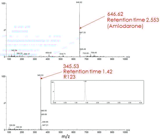 Mass spectrometry of butanol extracts of glioma cells after cultivation with Rh123 (2 µM) and amiodarone (2 µM). Only Rh123 + 110 and amiodarone molecules are detected (with retention times of 1.42 and 2.553 and mass/charge of 345.53 (bottom) and 646.62 (top) correspondingly).