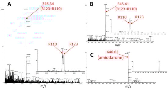 Mass spectrometry of butanol extracts of astroglial cells after cultivation with Rh123 (2 µM, (A)) or together with amiodarone (2 µM, (B,C)). In A, one major component is resolved apparently belonging to rhodamines 123 and 110 with mass/charge = 345.34 with retention times for Rh110 and 123, 1.35, and 1.44 correspondingly (inset). The incubation with amiodarone results in not many changes except the presence of amiodarone (inset).
