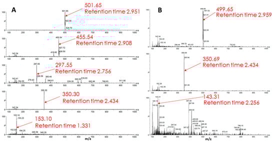 An analysis of a sample from glioma cells, which, after a standard 2-h incubation with Rh123 incubated in a cultivation medium for an additional 22 h, showed the presence of five components, presumably derivatives of Rh123 (Figure 10). It is noteworthy that the identified substances do not match those found in the extract from glioma cells incubated with Rh123 for 2 h. This implies that further modifications of the substances derived from Rh123 detected in samples after 2 h of exposure occur. To test this assumption, another sample was prepared, which was an extract from glioma cells incubated with Rh110 (2 µM) for two hours. Mass spectrometric analysis revealed three substances in the sample different from the original Rh110. It is worth noting that two of the three components (retention time ~2.95 min, the predominant ion with an m/z value equal to 501; retention time ~2.43 min, the predominant ion with an m/z value equal to 350) coincide with the components found in extracts from glioma cells, which, after a standard 2 h incubation with the Rh123 probe, were additionally incubated in pure medium for 22 h. This experimental observation supports the formation of Rh123 modifications in glioma through the step of deesterification and the formation of Rh110.