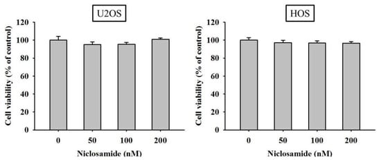 The cell viability of U2OS and HOS osteosarcoma cells at concentrations of 50, 100, and 200 nM niclosamide for 24 h was not significantly different from that of the controls (0 nM) in the MTT colorimetric assay (Figure 1). Thus, 24 h treatment with niclosamide at up to 200 nM had no cytotoxic effect on U2OS and HOS osteosarcoma cell lines. Thus, we used this concentration range for niclosamide in all subsequent experiments to investigate its antimetastatic properties.
