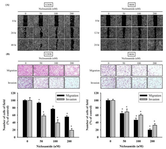 Effects of niclosamide on in vitro cellular motility, migration, and invasion of U2OS and HOS cells. (A) After different concentrations (0, 50, 100, and 200 nM) of niclosamide treatment for different time intervals in U2OS (0, 24, and 48 h) and HOS (0, 12, and 24 h) cells were detected by the wound-healing assay. (B) Cell migration and invasion assays after various concentrations (0, 50, 100, and 200 nM) of niclosamide treatment for 24 h in U2OS and HOS cells were measured, and illustrated after quantitative analysis. Results are shown as mean ± S.D with three independent experiments. * Significantly different: p < 0.05, when compared with the control group (0 nM).