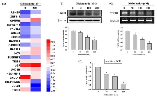 TGFBI expression of niclosamide-treated in osteosarcoma U2OS cells. (A) Heat map of the hierarchical clustering of 20 differentially expressed genes identified by RNA-Seq after treatment with 200 nM of niclosamide for 24 h in U2OS cells. (B) Western blot analysis, (C) RT-PCR, and (D) real-time PCR after various concentrations (0, 50, 100, and 200 nM) of niclosamide treatment for 24 h in U2OS cells were measured as described in the Materials and Methods section and the effects were illustrated after quantitative analysis. Results are shown as mean ±S.D with three independent experiments. One way ANOVA followed by Dunnett’s post hoc test was used. a Significantly different: p < 0.001, when compared with the control group (0 nM). Western blotting: F = 66.731, p < 0.001; RT-PCR: F = 159.980, p < 0.001; real-time PCR: F = 2237.390, p < 0.001.