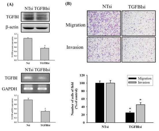 To further verify whether the reduction of TGFBI influences the migratory and invasive properties of U2OS cells, we transfected U2OS cells with a small interfering RNA (siRNA) targeting TGFBI expression for 72 h. We confirmed knockdown of TGFBI protein and mRNA levels through Western blotting and RT-PCR in U2OS cells, respectively (Figure 4A). Our results revealed that TGFBI siRNA reduced the TGFBI protein and mRNA levels by 45% and 54% in U2OS cells (Figure 4A). We then performed Boyden chamber migration and modified Matrigel invasion assays for 24 h while using siRNA of TGFBI to compare the amount of migratory and invasive cells. As shown in Figure 4B, the knockdown of TGFBI significantly decreased the migration and invasion by 75% and 54% of U2OS cells (p < 0.05) (Figure 4B).