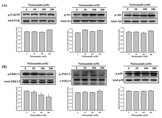 Effects of niclosamide on FAK-Src, PI3K-Akt and MAPKs signaling pathway in U2OS cells. Western blot analysis for total or phosphorylated forms of (A) FAK, Src, Akt, (B) ERK 1/2, JNK 1/2, and p38 after various concentrations (0, 50, 100, and 200 nM) of niclosamide treatment for 24 h in U2OS cells were measured as described in the Materials and Methods section. Results are shown as mean ± S.D with three independent experiments. One way ANOVA followed by Dunnett’s post hoc test was used. * p < 0.05, when compared with the control group (0 nM). P-ERK1/2: F = 15.004, p = 0.001.