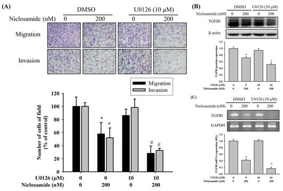 Effects of niclosamide on ERK to modulate TGFBI and biological behaviors of migration and invasion in U2OS cells. (A) Cell migration and invasion assays for effects of the inhibitor of MEK (U0126) for 24 h on U2OS cells with or without treatment of 200 nM niclosamide were measured and subsequently subjected to quantitative analysis. (B) Western blot analysis and (C) RT-PCR for U2OS cells with or without treatment of 200 nM niclosamide to determine effects of U0126 on TGFBI expressions were conducted. Results are shown as mean ± S.D with three independent experiments. * Significantly different, p < 0.05, when compared with U2OS cells without treatment of niclosamide and U0126. # Significantly different, p < 0.05, when compared with U2OS cells with niclosamide but without U0126.