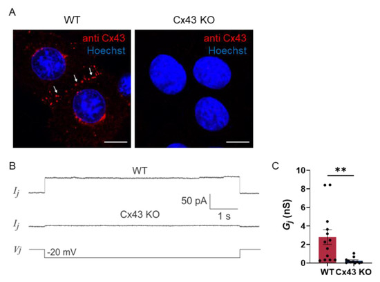We have previously shown that the CRISPR/Cas9 ablation of Cx43 significantly reduces the ability of REKs to pass dye [40]. Here, we show that Cx43 was undetected in Cx43 knockout (KO) REKs but was readily observed in gap junctions between wildtype REKs (Figure 1A, arrows). Dual whole cell patch clamp was used to record Ij for calculation of junctional coupling conductance (Gj). Cx43–KO REK cell pairs showed significantly reduced Gj compared to those of wildtype REKs (p < 0.01) (Figure 1B,C). Notably, Cx43-KO REKs retained low levels of Gjs, including some Ijs, showing voltage-dependent gating characteristic of gap junctions (data not shown), likely contributed by infrequent expression of other keratinocyte connexins. These findings reveal that Cx43 is the major contributor to the overall level of GJIC in REKs.
