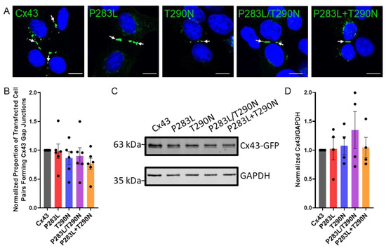 Previously, we demonstrated in a number of reports that GFP-tagging of Cx43 had no significant detrimental effect on the trafficking and assembly of Cx43 into gap junctions [40,46,47], thus we performed all experiments using GFP-tagged Cx43 and variants. High resolution fluorescence imaging revealed that Cx43-ablated REKs expressing either wildtype or EKVP-associated Cx43 variants in isolation (P283L and T290N alone) or in combination (i.e., P283L/T290N mutations within the same plasmid or P283L + T290N mutations engineered on separate plasmids) formed prototypical gap junctions (Figure 2A, arrows). Quantification of the proportion of transfected cell pairs that formed Cx43 gap junction plaques at cell–cell interfaces revealed that wildtype and Cx43 variants were equally efficient at forming gap junctions (Figure 2B). It is also notable that the variants did not change the integrity of the cells, as there was no evidence of dead or dying cells as revealed by the absence of cell blebbing or pyknotic nuclei. Western blotting for Cx43 revealed that Cx43-KO REKs efficiently, and approximately equally, expressed GFP-tagged Cx43 and variants (Figure 2C,D). Since the EKVP-associated variants being examined here are inherited in an autosomal dominant manner, we wanted to assess whether the presence of endogenous Cx43 would affect their ability to form gap junctions. To that end, all variants assessed in isolation or combination readily assembled into gap junctions when expressed in wildtype REKs that are rich in endogenous Cx43 (Figure S1).