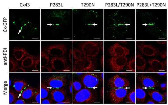 In the current study, we examined the cellular distribution, trafficking, stability, and functional status of the P283L and T290N variants individually and in combination. To avoid a reliance on connexin-deficient reference cells from tissue unrelated to the skin, we employed spontaneously immortalized rat epidermal keratinocytes (REKs) that retain the capacity to fully differentiate into organotypic epidermis [40,41]. In some cases, REKs were used that were CRISPR/Cas9 engineered to ablate Cx43 expression, to allow for the functional status of the variants to be assessed in keratinocytes in the absence of endogenous Cx43 [40].