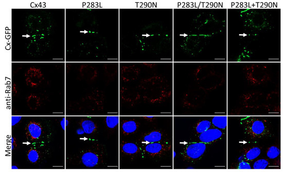 The initial case report using patient biopsies suggested the Cx43 variants were possibly intracellularly retained [18]. While this was not a prevailing feature in our study, Cx43 or variant expressing REKs were counterstained for protein disulfide isomerase (PDI) (Figure 3), GM130 (Figure S2), or Rab7 (Figure 4), respectively. High-resolution fluorescence microscopy revealed that wildtype or Cx43 variants were rarely identified in the ER, Golgi apparatus, or Rab7-positive endosomes. Collectively, these findings suggest that EKVP-associated variants are not trafficking-defective and are readily transported to the cell surface for gap junction assembly when expressed in REKs.