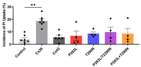 Hemichannel function was assessed by a dye uptake assay, similar to Tong et al. (2007) [45]. Connexin-deficient HeLa cells were seeded on glass coverslips in six-well plates at low density, transfected, and incubated for 24 h at 37 °C and 5% CO2. Growth media was aspirated, and cells were gently washed twice with divalent cation-free extracellular solution (DCF-ECS) (140 mM NaCl, 5.4 mM KCl, 2 mM EGTA, 10 mM HEPES, 25 mM D-glucose, osmolarity 298 mOsm, pH 7.35) and incubated in 1 mL DCF-ECS containing 0.15 mM propidium iodide (PI; 668.4 Da) (ThermoFisher, Cat#P1304MP) for 15 min. The incubation solution was then aspirated, and the cells were gently washed three times with regular extracellular solution (ECS) (140 mM NaCl, 5.4 mM KCl, 1.4 mM MgCl2, 2 mM CaCl2, 10 mM HEPES, 25 mM D-glucose, osmolarity 298 mOsm, pH 7.35). Cells were subsequently fixed with 4% paraformaldehyde for 20 min at room temperature, nuclei counterstained with Hoechst 33342, and the coverslips mounted onto glass microscope slides using Airvol mounting medium. Images were captured on a Zeiss LSM 800 confocal Airyscan microscope equipped with a 10× objective lens. A third-party investigator, blinded to the treatment, was used to quantitate the percentage of GFP-positive connexin-expressing cells loaded with PI. Between 30 and 160 cells were counted for each coverslip in each experimental group.