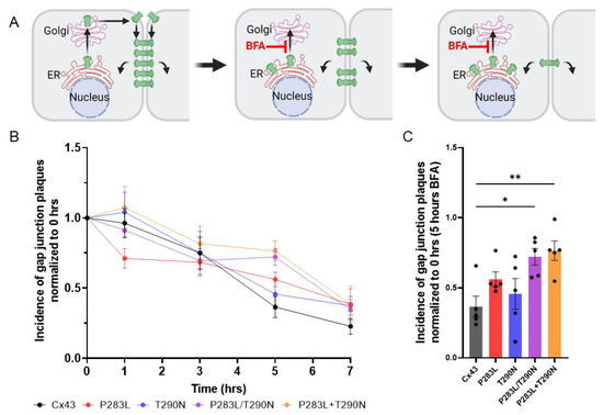 The P283L and T290N variants in combination prolong the clearing of Cx43 gap junctions. (A) Schematic illustrating the site of brefeldin A (BFA) action in blocking protein secretion. (B) Quantification of gap junction plaques observed in Cx43–KO REKs expressing GFP-tagged wildtype or Cx43 variants after treating with BFA from 0 to 7 h. (C) Incidence of gap junction plaques found at cell–cell interfaces 5 h after BFA treatment * p < 0.05; ** p <0.01. Schematic in panel A was created using BioRender.com.