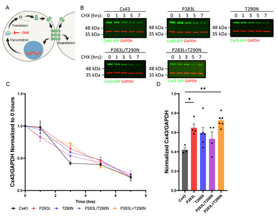 The P283L variant contributes to a slower degradation of Cx43. (A) Illustration of cycloheximide (CHX) inhibition of protein synthesis in the context of the Cx43 lifecycle from transcription through to internalization and degradation. (B) Immunoblots of Cx43–KO REKs expressing GFP-tagged wildtype or Cx43 variants (green) treated with CHX for 0 to 7 h. GAPDH (red) was used as an internal control. (C) The Cx43/GAPDH ratio was calculated and normalized to 1. (D) After 3 h of CHX treatment, the P283L and P283L + T290N variants were found to be significantly higher than wildtype Cx43. * p < 0.05; ** p < 0.01. Schematic in panel A was created using BioRender.com.