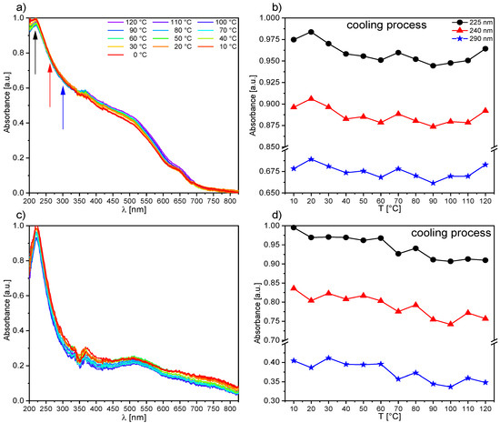 Both Sample 1 and Sample 2 absorbed in the 200–700 nm range (brown color of maghemite γ-Fe2O3 nanoparticles [42]) with clear absorption bands around 220, 370, 500, and 650 nm (Figure 1a,c). Intensity of absorption was much lower for Sample 2 than for Sample 1 (between 250 nm and ca. 600 nm). In our opinion, this could be due to the fact that Sample 2 contained fewer γ-Fe2O3 nanoparticles, which in addition were immersed in oleic acid. It is possible that oleic acid, in measuring the wavelength range, was transparent, so it did not absorb. It was noteworthy that absorption of indicated wavelengths (e.g., 225, 240, and 290 nm, marked by arrows in Figure 1a) behaved the same for both samples (oscillated), and did not change significantly upon cooling from 120 °C down to 0 °C (Figure 1b,d), although the absorbance at the wavelengths under consideration was much lower after the addition of oleic acid. Interestingly, at 225 nm, Sample 1 (pure nanoparticles), as well as Sample 2 (with oleic acid), absorbed almost all the incident radiation, while the absorption band width with a maximum of around 220 nm was narrower for Sample 2. In summary, the oleic acid significantly modified the optical properties of the nanoparticles used.