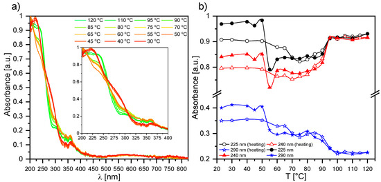 Solid state UV-vis absorption spectra of Composite 1 (pure EHPDB) at several chosen temperatures in the 200–850 nm range during cooling (a), and temperature dependence of the absorbance at around 225, 240 and 290 nm (b). The inset in graph (a) presents an enlarged region of 200–400 nm.