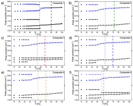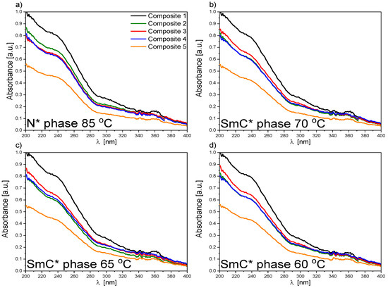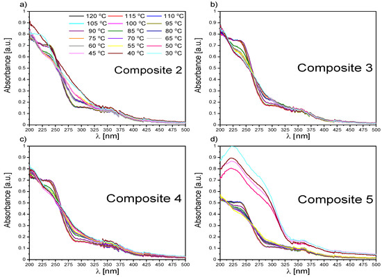 Both the undoped sample (Composite 1) and doped samples (Composites 2–5) showed no absorption of incident light in the 500–850 nm range (the absorbance was below 5%; however, this spectral range had a low signal-to-noise ratio, regardless of temperature), which means that Composites 1–5 were transparent in this range. Figure 3 presents the spectral range of 200–500 nm and a high absorbance of the created nanocomposites (Composites 2–5) in the UV region, indicating almost complete absorption of incident radiation. However, a decrease in absorbance with an increase in the γ-Fe2O3 admixture concentration was visible. The nanoparticles in the organic matrix most likely acted as a scattering agent in the UV region. As is seen in Figure S3, the temperatures at which the absorbance changed corresponded to the phase transition temperatures obtained by the DSC method [39].