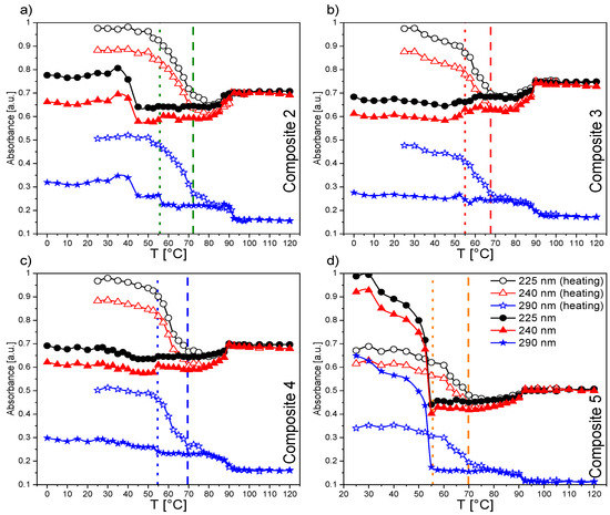 Influence of heating and cooling on the absorbance at 225, 240, and 290 nm for Composite 2 (a), Composite 3 (b), Composite 4 (c), and Composite 5 (d). The legend in graph (d) is the same for all graphs. The vertical dashed and dotted lines represent the SmA*–SmC* and SmC*–Cr1 phase transition temperatures (during cooling), respectively.
