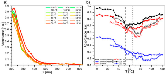 Temperature’s influence on the absorbance of a pure ferroelectric liquid crystal EHPDB (Composite 1) was investigated during heating and subsequent cooling (23 °C–120 °C–23 °C). As is seen in Figure 2a, one absorption band in the UV region with a maximum around 225 nm was well visible for Composite 1 at room temperature. Figure S1 presents the absorption spectra registered for several chosen temperatures during heating of Composite 1, and for better clarity, the temperature dependence of the first derivative of the absorbance for selected wavelengths. After heating above 70 °C (see Figure 2b and Figure S1), for wavelengths of 225 nm, 240 nm, and 290 nm, the absorbance slightly decreased, which was related to the phase transition of crystal to liquid crystalline state, and was in good agreement with the DSC results [39]. Upon further heating, the absorbance increased for wavelengths of 225 nm and 240 nm exponentially up to about 95 °C, above which the absorbance stabilized up to at least 120 °C (Figure 2b). This behavior was related to the phase transition from the liquid crystalline state to an isotropic liquid, and was also in agreement with the DSC results [39]. Interestingly, the absorbance for the wavelength of 290 nm behaved quite differently during further heating; from the phase transition to the SmC* phase, it monotonically decreases. Upon subsequent cooling, the spectra remain unchanged down to 95 °C, while below this value the absorbance for 225 nm and 240 nm decreased with decreasing temperature, down to ca. 50 °C. In turn, for the wavelength of 290 nm, there was an increase in the absorbance up to the crystal phase. A clear jump at the phase transition to crystal phase was well visible in the absorbance for all mentioned wavelengths. As is seen in Figure 2a, the sample became a nonabsorbent material from ca. 425 nm, and only at ca. 575 nm and 750 nm did the absorbance begin to slight increase, but it was still at a level of 5%.