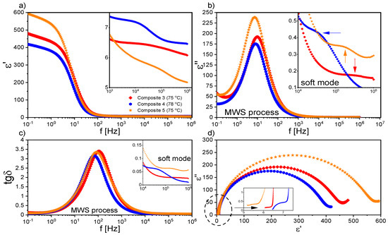 Dielectric dispersion (a) and absorption (b), loss tangent versus frequency (c), and Cole–Cole plot (d) for Composites 3–5 in the TGBA*/SmA* phase. Insets present the high-frequency range. The legend in graph (a) is the same for all graphs.